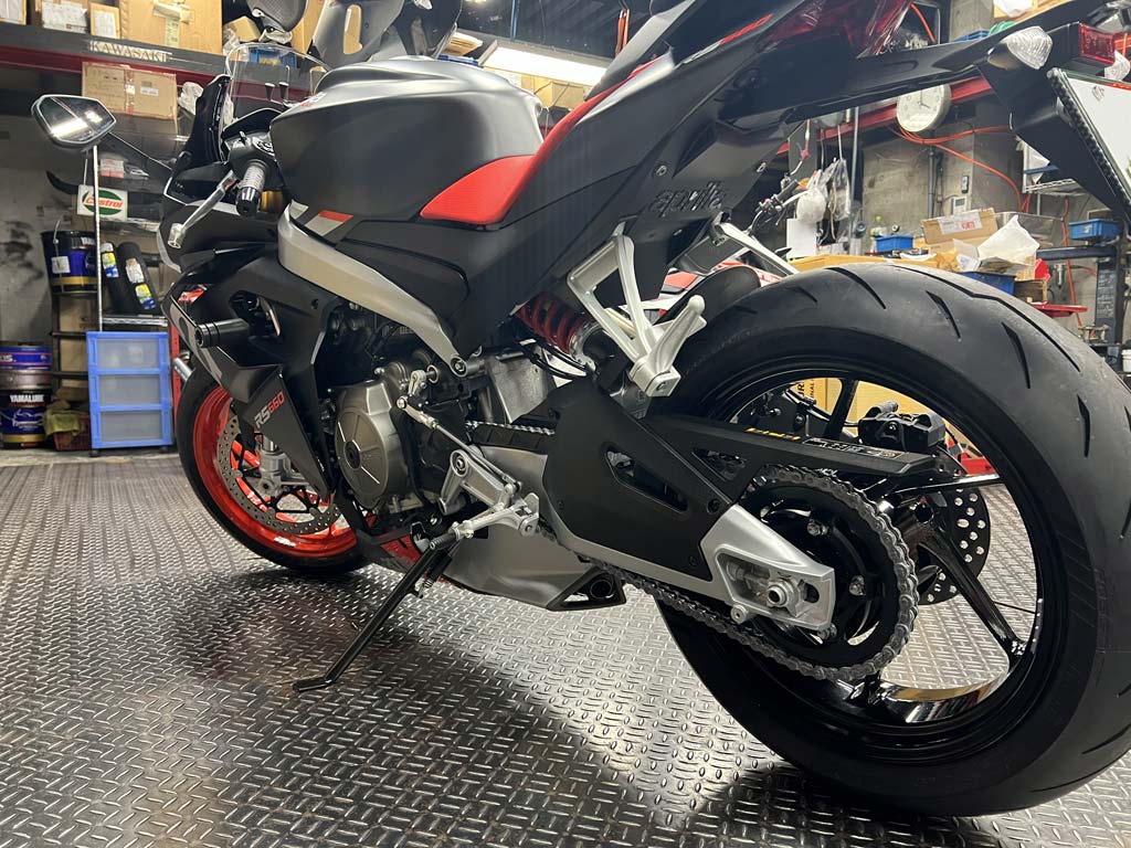�t���[��������Ɍy�ʂ��s���Ȃ��̂Ƃ��邽�߁A�X�C���O�A�[�����G���W���ɒ��ڎ��t���Ă��܂��B����͂��̒���������Ƃ����̒����ł���A�œK�ȃg���N�V�������Ώ̃A�[���𐬌`�����Ŗ𗧂��܂��B����̓A�v�����ARS �̗��j�ɂ����Ĉ�ʓI�ƂȂ��Ă���Z�p�I�I���ł��B�A�W���X�^�u���V���b�N�A�u�\�[�o�[�̎��t�����@�́A�����P�[�W����邱�ƂȂ��D�ꂽ�쓮�����\�ƂȂ�A�d�ʂ�����Ɍy���ł��܂��B�t���[���̐v�ɂ������ăA�v�����A�̃f�U�C�i�[�̓X�g���[�g�����ăT�[�L�b�g�̗����ŕK�v�ȍ������m�ۂ��Ȃ������I�ȃ��C�f�B���O�̂��߂ɐ��a���������}���邽�߂̃X�e�A�����O�w�b�h�ɓ��ɔz�����܂����B�V���[�V��41mm �a��KYB ���A�W���X�^�u���|���t�����t�H�[�N���̗p�A���a320 mm �̃X�`�[���f�B�X�N�A�ǂ����Brembo ���̃��W�A���}�E���g�L�����p�[�ƃ��W�A���}�X�^�[�V�����_�[�ō\�������u���[�L�V�X�e�����̗p���Ă��܂��BRS 660 �̃t�����g�^�C����120/70 ZR 17�A���A��180/55 ZR 17 �̍����\Pirelli Diablo Rosso Corsa II �^�C�������Ă���A�X�g���[�g�ł̈��S���Ɗy�����A�T�[�L�b�g�ōō��̃p�t�H�[�}���X�������o�����߂̃O���b�v��ۏ��܂��BRS660 �̃n���h�����O�A�r�q�������ăR���p�N�g���ƃG���W�����\��g�ݍ��킹�邱�ƂŃ��C�_�[����J���邱�ƂȂ��R�[�i�[�̑������ł̊y�����ƃX�����𖡂키���Ƃ��ł��܂��B