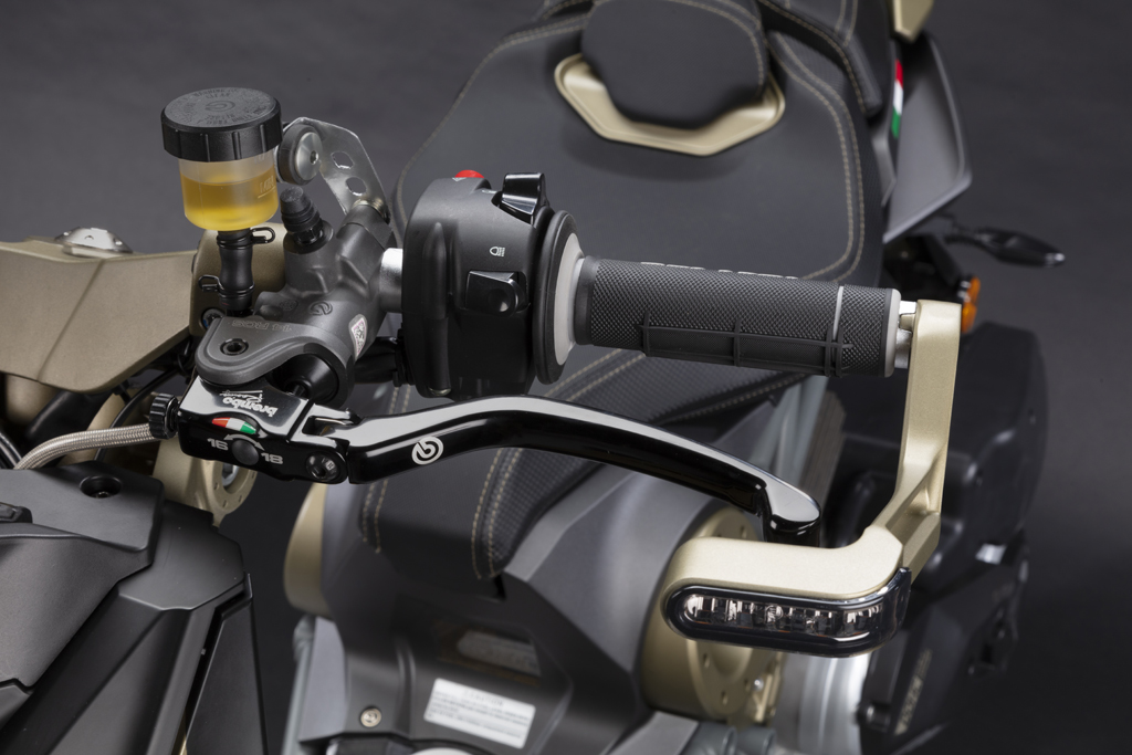 シリンダー部分がハンドルバー(グリップ)と90度に直交する配置。操作するライダーを“中心”に考えれば、シリンダーがラジアル(放射状)に配置されている。レバーを操作する力がほぼ真っ直ぐピストンを押すので操作力の摩擦損失も少なく、レバーを引き込んでもフィーリングが変化しない。横押し式もラジアル式も、他のブレーキを構成するパーツが同じモノならば、制動力の強さ自体は変わらないがブレーキは、ライダーがどれだけ思い通りにかけられるかが重要。どんなに強力なブレーキでも、コントロール性に不安があれば強くかけられないため、結果として“効かない(使えない)ブレーキ”になってしまうため、最大限の制動力を求めるには理想的な構造。