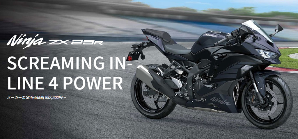 250cc�N���X�ɁA�Җ]�̕���4�C���G���W���𓋍ڂ����X�[�p�[�X�|�[�c���f��Ninja ZX-25R�o��B�ő�o��33kw�i45PS�j������G���W���A���\�I�ȃG�L�]�[�X�g�T�E���h�A���̃p�t�H�[�}���X���ő���Ɉ����o���t���[���A�A�O���b�V�u��Ninja�X�^�C�����O�AKTRC�i�J���T�L�g���N�V�����R���g���[���j��I�[�g�u���b�p�[�t��KQS�i�J���T�L�N�C�b�N�V�t�^�[�j���͂��߂Ƃ��鐔�����̗p���ꂽ��i�̃��C�_�[�T�|�[�g�V�X�e���𓋍ڂ��ANinja ZX�V���[�Y�𖼏��ɂӂ��킵�����f���Ɏd�オ���Ă��܂��B�T�[�L�b�g���s���\�̍����ɉ����A�X���ł̉��K�������������̃��f���́A�G���W����]���̏㏸�ƂƂ��Ƀ��C�_�[�����̖��̗͂��ɂ��܂��B