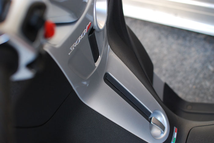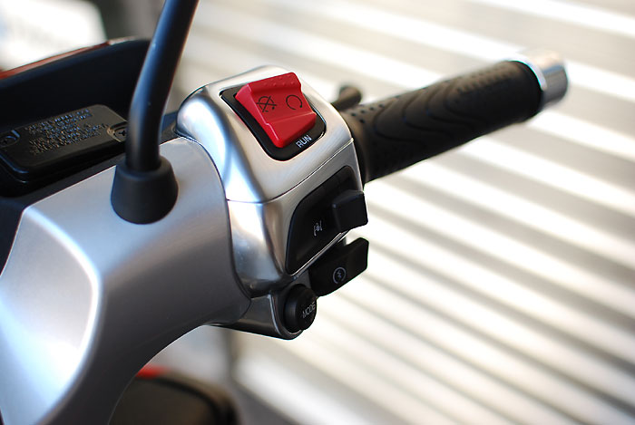�p�[�L���O���o�[��ɂ��鍕���t�^�́A����]������ƃR���r�j�t�b�N�ɐؑւ���܂��BPIAGGIO�n�X�N�[�^�[�ɑ����T�C�h�ɃX���C�h�����Ďg�p����t�b�N�������x����������ہB |