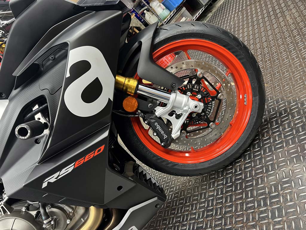 �t���[��������Ɍy�ʂ��s���Ȃ��̂Ƃ��邽�߁A�X�C���O�A�[�����G���W���ɒ��ڎ��t���Ă��܂��B����͂��̒���������Ƃ����̒����ł���A�œK�ȃg���N�V�������Ώ̃A�[���𐬌`�����Ŗ𗧂��܂��B����̓A�v�����ARS �̗��j�ɂ����Ĉ�ʓI�ƂȂ��Ă���Z�p�I�I���ł��B�A�W���X�^�u���V���b�N�A�u�\�[�o�[�̎��t�����@�́A�����P�[�W����邱�ƂȂ��D�ꂽ�쓮�����\�ƂȂ�A�d�ʂ�����Ɍy���ł��܂��B�t���[���̐v�ɂ������ăA�v�����A�̃f�U�C�i�[�̓X�g���[�g�����ăT�[�L�b�g�̗����ŕK�v�ȍ������m�ۂ��Ȃ������I�ȃ��C�f�B���O�̂��߂ɐ��a���������}���邽�߂̃X�e�A�����O�w�b�h�ɓ��ɔz�����܂����B�V���[�V��41mm �a��KYB ���A�W���X�^�u���|���t�����t�H�[�N���̗p�A���a320 mm �̃X�`�[���f�B�X�N�A�ǂ����Brembo ���̃��W�A���}�E���g�L�����p�[�ƃ��W�A���}�X�^�[�V�����_�[�ō\�������u���[�L�V�X�e�����̗p���Ă��܂��BRS 660 �̃t�����g�^�C����120/70 ZR 17�A���A��180/55 ZR 17 �̍����\Pirelli Diablo Rosso Corsa II �^�C�������Ă���A�X�g���[�g�ł̈��S���Ɗy�����A�T�[�L�b�g�ōō��̃p�t�H�[�}���X�������o�����߂̃O���b�v��ۏ��܂��BRS660 �̃n���h�����O�A�r�q�������ăR���p�N�g���ƃG���W�����\��g�ݍ��킹�邱�ƂŃ��C�_�[����J���邱�ƂȂ��R�[�i�[�̑������ł̊y�����ƃX�����𖡂키���Ƃ��ł��܂��B