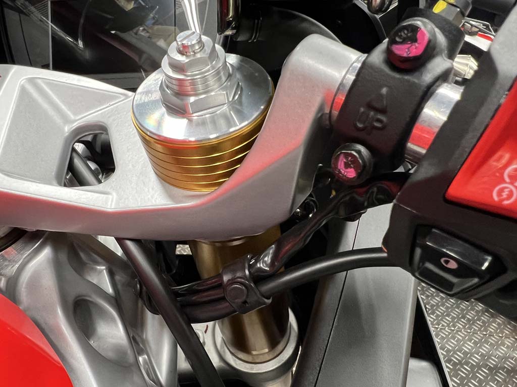 �A�v�����A�̐V�^�c�C���V�����_�[�́ARSV4 �̃p���t���ȃG���W���J���ɂ�������т̎����ł���A�����I���Z�p�I�ȃg���C�A���̔w�i�Ɋ�Â����̂ł��B�V�����_�[�w�b�h�A�R�Ď��A�_�N�g�A�V�����_�[�����ăs�X�g���͑S��V4 �R���ł��B���l�ɁA1078 cc V4 �G���W���Ɠ����悤��63.9 mm �X�g���[�N��81mm �̃{�A���̗p���Ă��܂��BV4 �Z�p���̗p����Ƃ�������ɂ���čō��̐��\��ۏ��Ȃ���A���̔r�C�ʂƔ�r���č����s�X�g���X�g���[�N���x�𗼗������邱�Ƃ��\�ƂȂ�܂����B���R�̂��ƂȂ���A���^����^���܂߂��S�ẴG���W���R���|�[�l���g���[������J�����Ă��܂��B�V�����G���W���ł̓N�����N�P�[�X������������2 �̃s�[�X�ɕ�����Ă���A�V�����_�[���A�b�p�[�N�����N�P�[�X�ɓ������邱�ƂőS�̓I�Ȑ��@���팸���A���拭�ȍ\�����������Ă��܂��B�V�����_�[�̓N�����N�V���t�g���牡�����ɃI�t�Z�b�g����Ă���A�s�X�g���^�����̓������C���ŏ����ɗ}���܂��B4 �o���u �c�C���V���t�g�̒���J���V���t�g�̓T�C�h�`�F�[���ŋ쓮���܂��B�@�B�����������N���b�`�ł̓A�V�X�g�y�уX���b�p�\�V�X�e���𓋍ڂ��Ă��܂��B