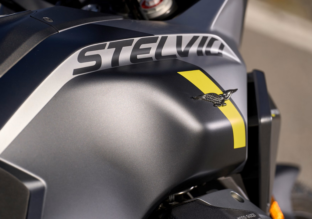 ステルビオは、Moto Guzzi の革新的なV ツイン「コンパクト ブロック」エンジンの動力を、ドライブシャフトが駆動します。1,042 cc エンジンはEuro5+の規制をクリアし、8,700 rpm で 115 HP の最大出力と、6,750 rpm で 105 Nm の最大トルクを実現します。